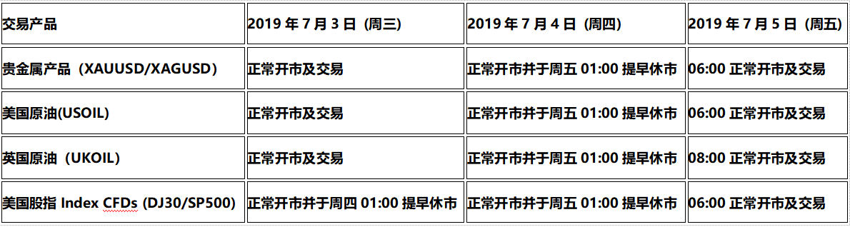 1.外汇货币对和其他股指产品的交易不受本次美国独立日假期休市影响。