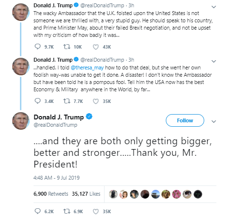 周二美国总统特朗普连续发推, 炮轰印度政府及英国首相特蕾莎梅,他声称 “印度长期以来一直对美国产品征收关税。不再可接受!” 特朗普称英国大使达罗克是一个“蠢货”,嘲讽特蕾莎政府的脱欧谈判,称自己在脱欧问题上对特雷莎•梅进行了“指导”,但她“仍坚持自己的蠢办法”。