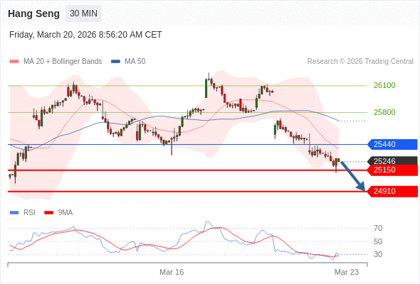 恒生指数 当日内: 下跌趋势。