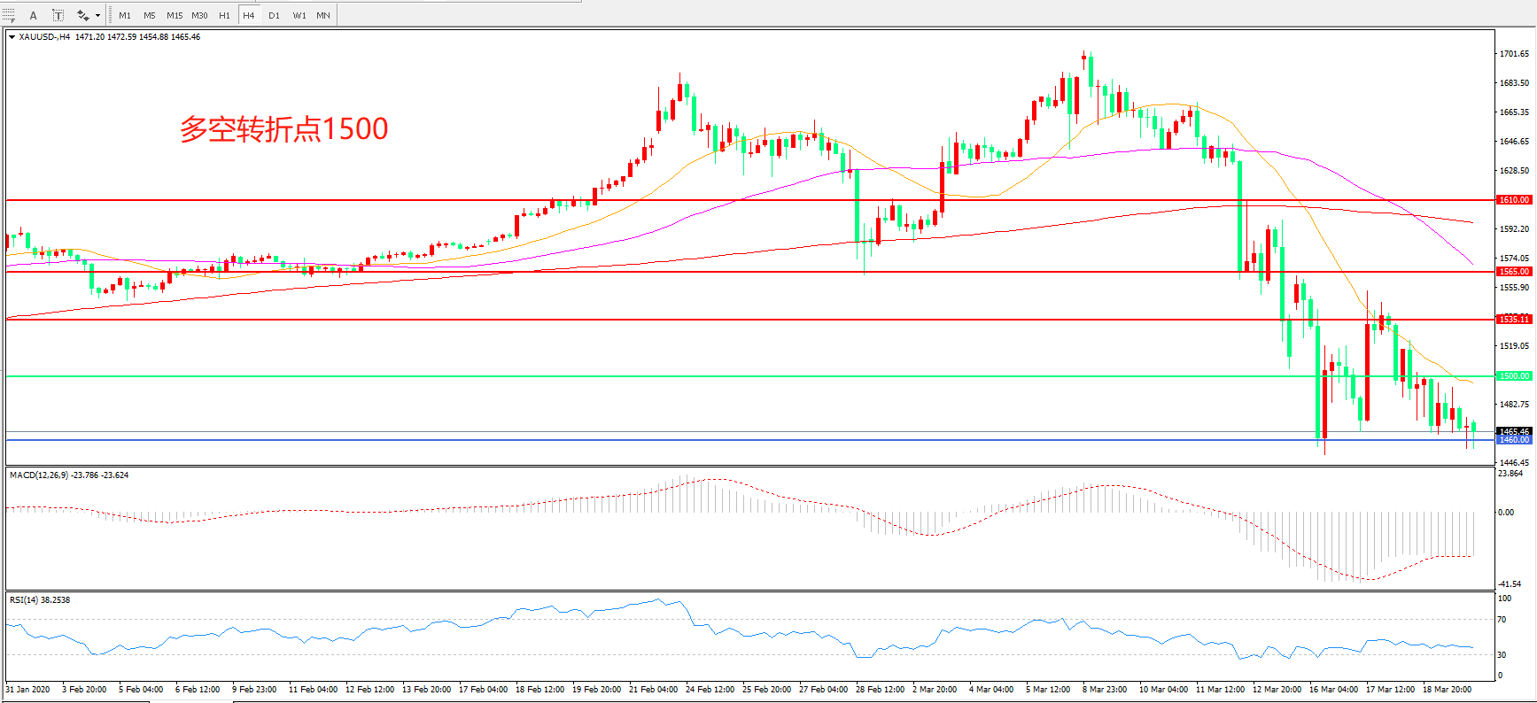 交易策略: 在 1500.00之下看跌,目标1460.00 1400.00