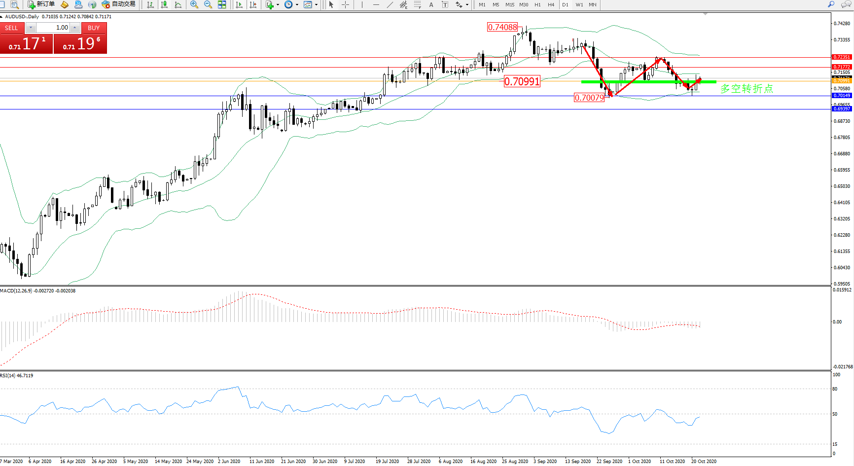 交易策略:0.70991上方看涨,目标0.71772、0.72351
