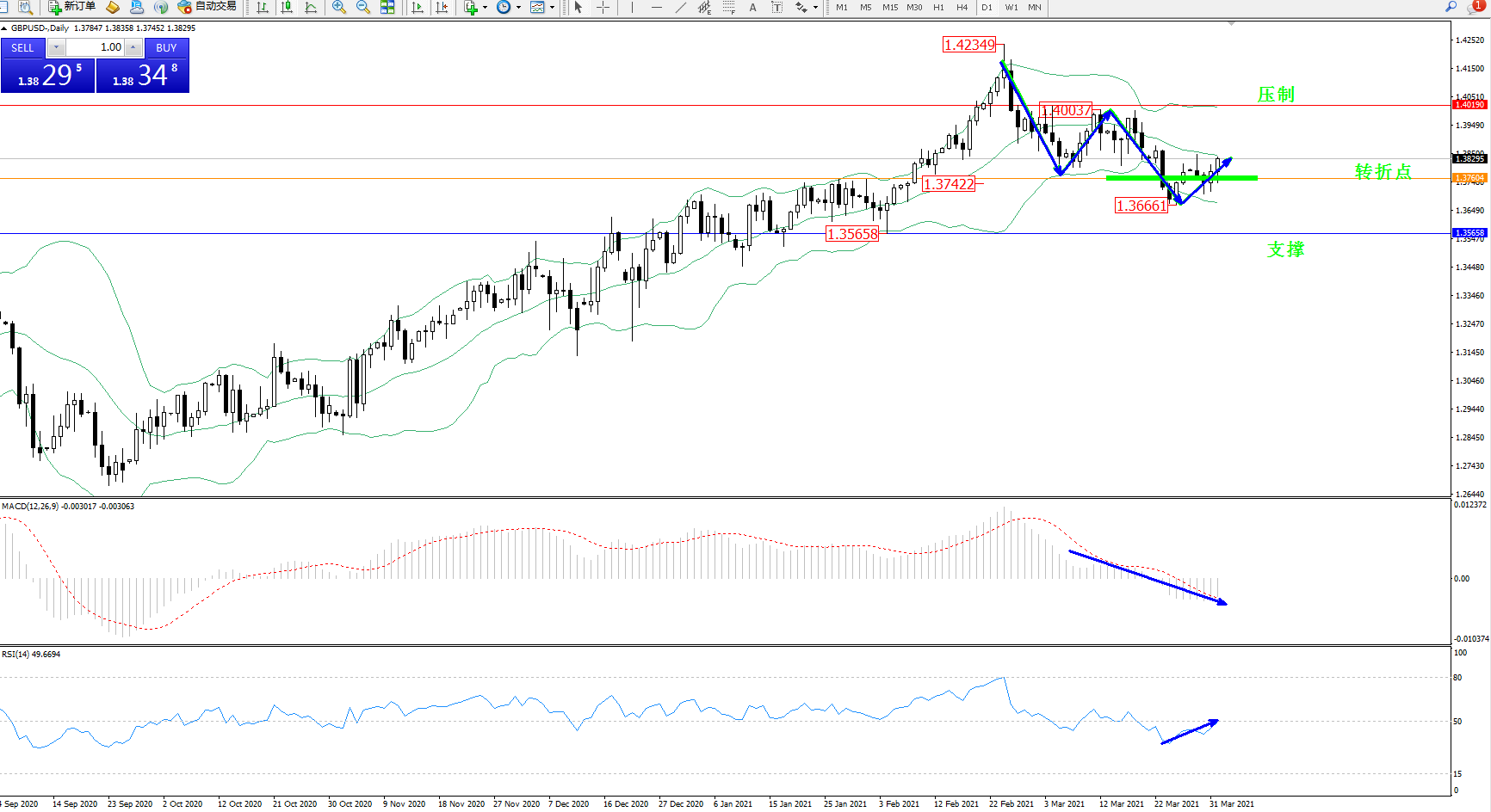 高位空头动力延续布林带指标通道中下轨区间持续震荡向下移动,低位抵达1.36661位置后得到支撑反转震荡上移,触及中轨附近节点后有继续向上移动态势,布林带指标呈缓慢张口走势持续中,关注中轨附近节点,是方压制关注布林带指标上轨1.40190附近节点,低位支撑关注1.35658附近,关注1.37604附近转折点,MACD指标空头动力弱势维持在0轴线下方持续徘徊,RSI指标处于空头区域窄幅震荡缓慢上移至50均衡线附近弱势整理中,如图: