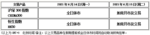 因应2021年6月14日(周一)为中国市场端午节假期,沪深300指数和恒生指数将于假期期间全日休市,敬请阁下留意知悉。