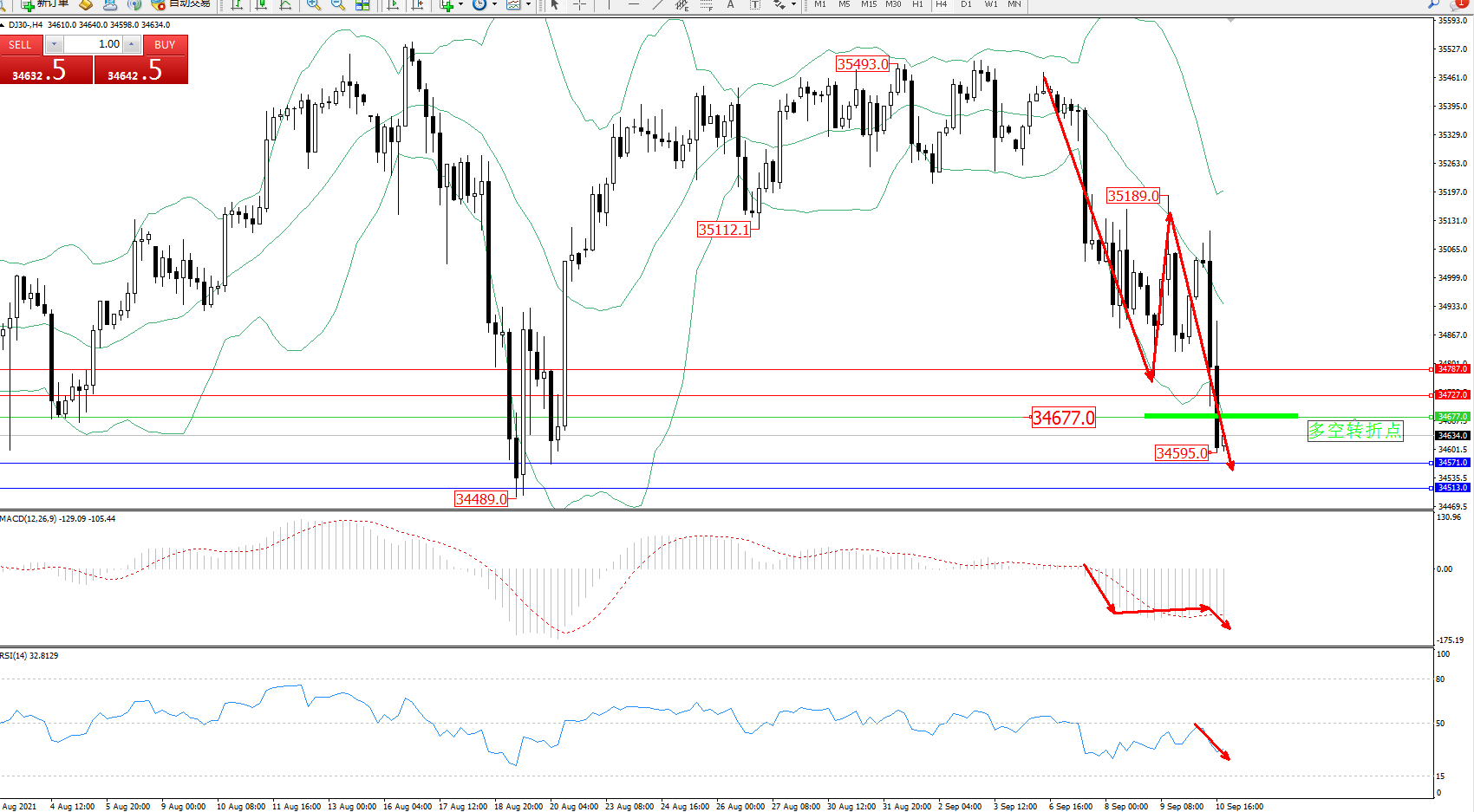 技术点评:高位空头动力维持在布林带指标通道中下轨区间呈宽幅震荡向下移动中,空头动力跌势未见止步,前期低位34489位置近在咫尺破位在即,布林带指标呈收口下行走势后再度张口,MACD指标处于空头区域低位震荡向下移动,RSI指标处于空头区域维持震荡下行中;