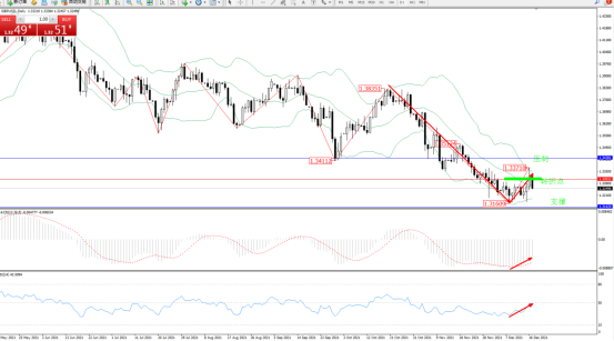 高位空头动力延续布林带指标通道中下轨区间持续震荡下行,低位抵达1.31609位置后得到支撑开始短暂整理,多头动力伺机入场,触及布林带指标上轨1.33710位置后遇阻回撤,布林带指标呈收口走势良好,上方压制关注1.34281位置,低位支撑关注1.31420位置,关注1.33033位置转折点,MACD指标处于空头区域低位震荡缓慢上移,RSI指标处于空头区域持续震荡上移至50均衡线附近遇阻震荡;