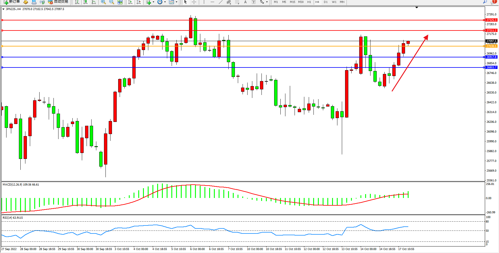 日经指数JPN225——4小时K线图显示:
