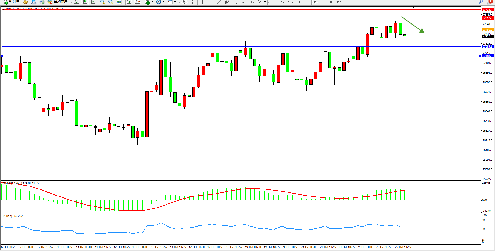 日经指数JPN225——4小时K线图显示: