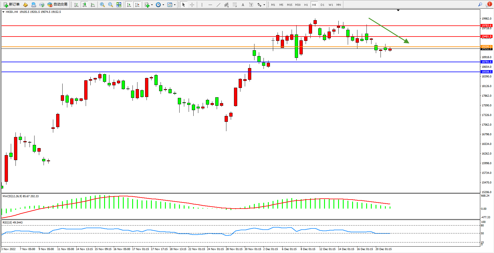 4小时图看:高位空头动力窄幅震荡下移,市场空头情绪涌现,短期跌势减弱,但依旧有进一步向下移动态势,MACD指标处于0轴线上側弱势徘徊,RSI指标处于50均衡线附近弱势整理;