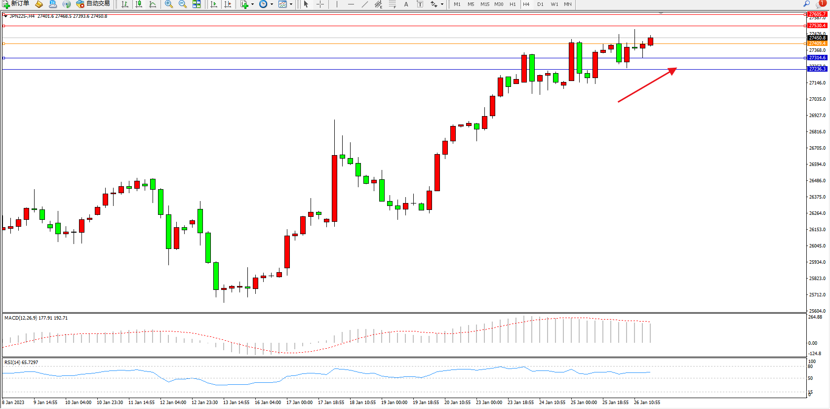 日经指数JPN225——4小时K线图显示: