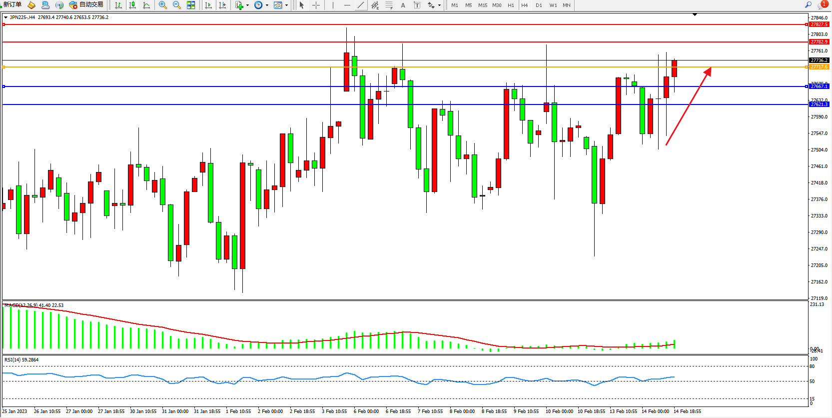 日经指数JPN225——4小时K线图显示: