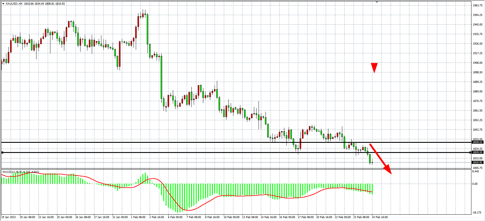 4小时图看,金价跌破1820后继续扩大跌幅,MACD在零轴之下呈继续放量状态,行情或进一步走空,当前1820-1830为强阻力区域,日内在1820之下继续看空为主,下看1800-1780附近。