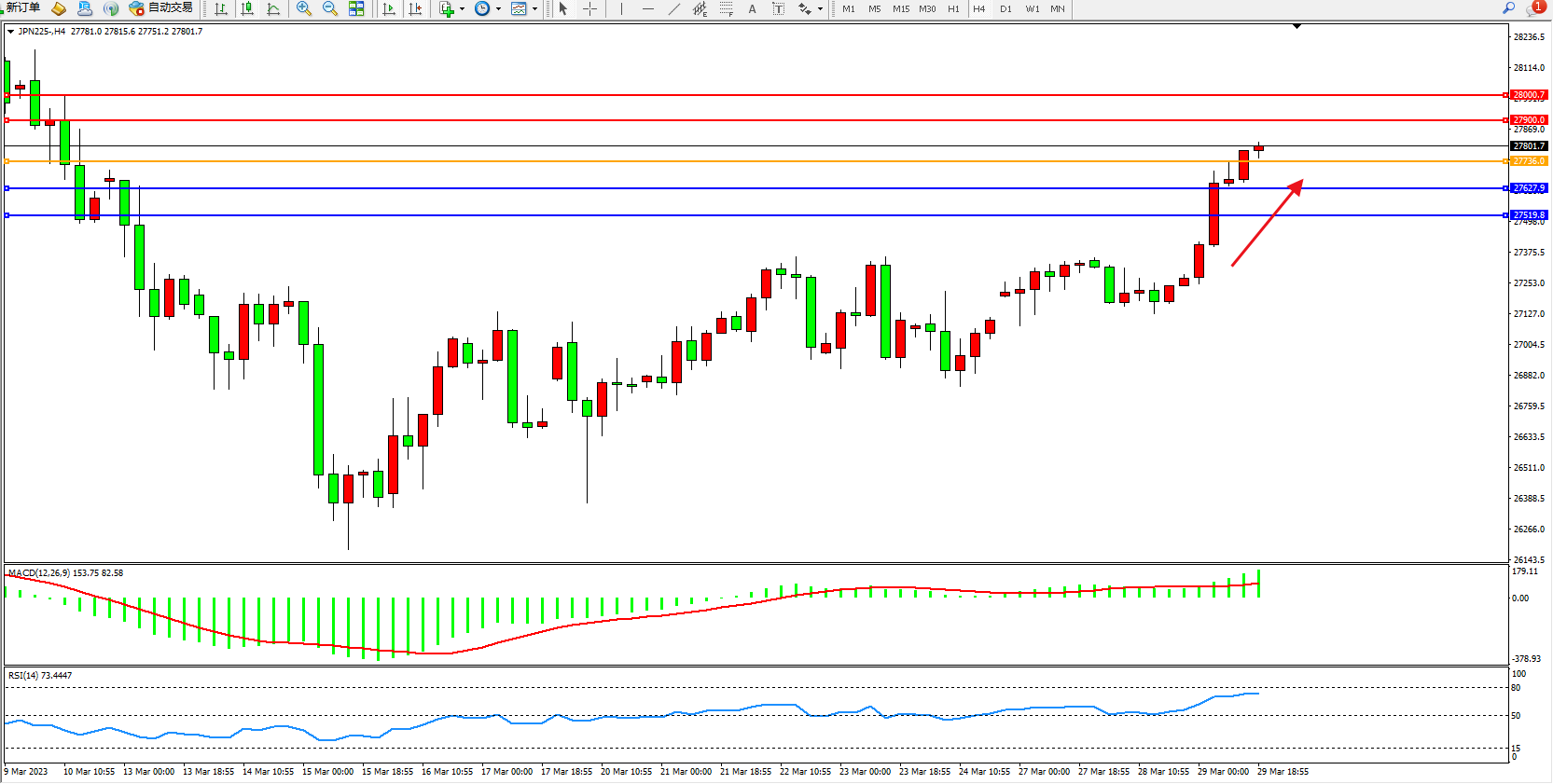 日经指数JPN225——4小时K线图显示: