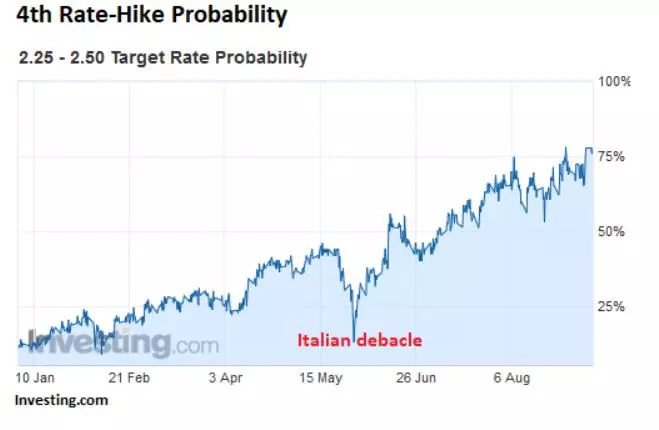 据 CME 美联储观察,2018年第四次加息的概率在年初时只有10%,现在为77%。